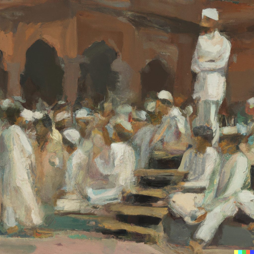 Upon reaching the steps of Jama Masjid, I noticed a gathering encircling a man dressed in a white kurta and a Nehru-style cap, passionately recounting a story. He began his recitation with a tale from the "Dastan-i-Amir Hamza." Intrigued by the storyteller, I approached a nearby individual and inquired about the man. The person informed me that he was a Dastan-go, a storyteller, who would be sharing twenty thousand separate stories from today until the following month.